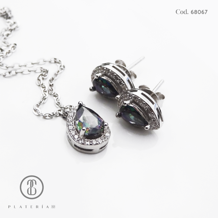 JUEGO RODINADO GOTA TORNASOL CIERRE BOLITA PLATA.925